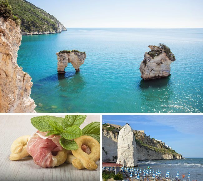 Il territorio del Gargano, spesso nominato come lo "Sperone d'Italia", è un promontorio montuoso situato nel Nord della Puglia e costituisce uno dei principali poli turistici della penisola. Parte di questo territorio è ricoperto dalla zona protetta del Parco Nazionale del Gargano, il quale rappresenta il vicino entroterra di una costa dal fascino indescrivibile. Luoghi suggestivi come il Fiordo del Furore o le numerose spiagge delle principali località balneari di Peschici, Vieste, Mattinata e Rodi Garganico garantiscono paesaggi e relax presso una delle zone più belle d'Italia. La gastronomia locale propone la cucina mediterranea dai sapori delicati, alimenti genuini che rigorosamente vengono prodotti in loco.